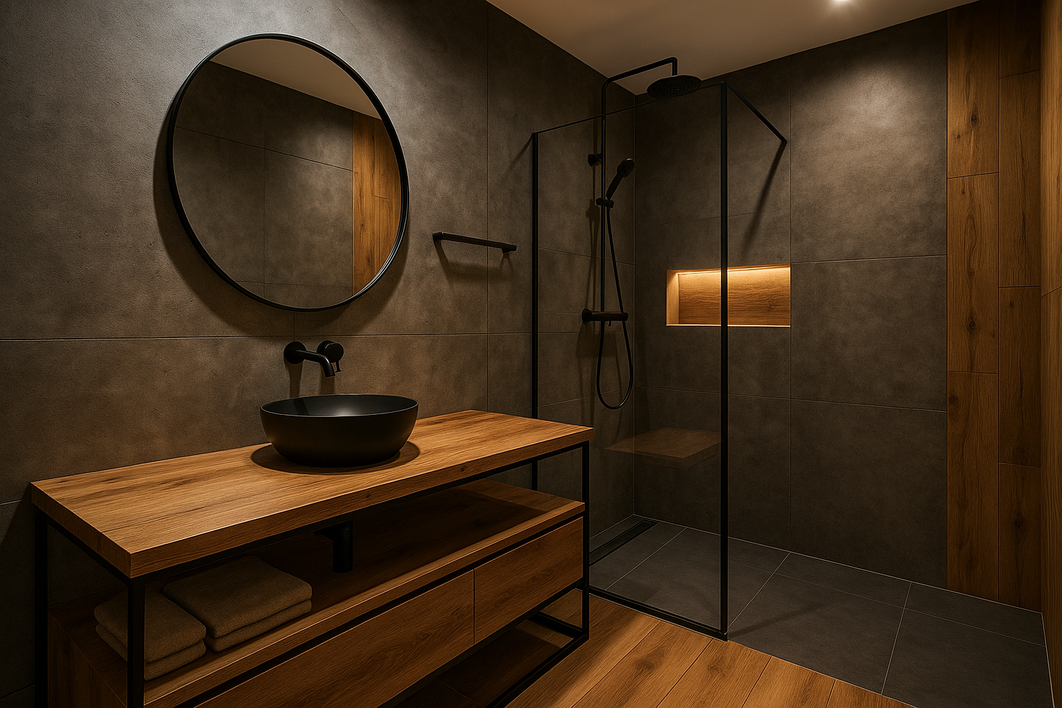 Industrialna łazienka z drewnem – precyzyjne budowanie struktury